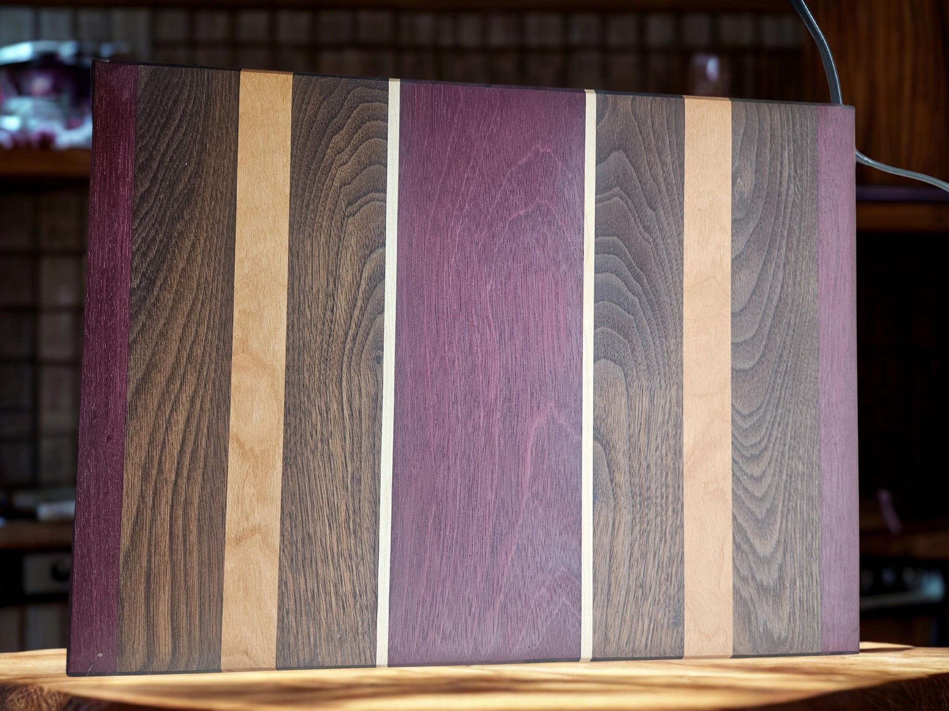 Crafted by hand from premium Purple Heart, Walnut, Maple, and Cherry, each board is a one-of-a-kind blend of natural beauty and craftsmanship. Every piece highlights the unique grain and color of the woods, creating a stunning, durable board meant to last a lifetime. What truly makes it special? Personalization. Your board is laser-engraved with a design, name, or message of your choice—making it a meaningful gift or showpiece for your kitchen. Handmade with care, built to impress, and customized to tell your story.