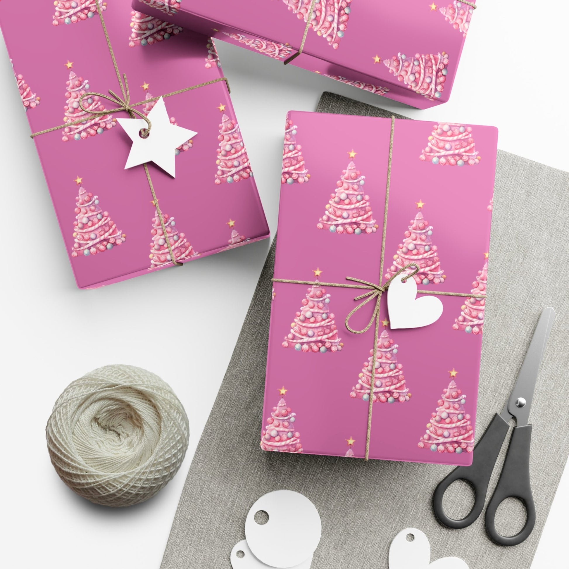 Unwrap the magic of the holiday season with our "Whimsical Pink Christmas Trees Gift Wrap!" This isn't your average wrapping paper. Designed with the modern woman in mind, our gift wrap boasts a lush, velvety pink backdrop adorned with raised, three-dimensional pink Christmas trees that seem to dance across the paper. Each tree is meticulously detailed with radiant gold stars and lustrous pearl embellishments, giving your presents a touch of luxe elegance.